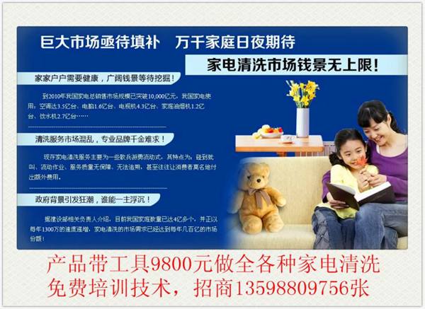 洗多多家電清洗招商加盟中心推出的有家用空調(diào)內(nèi)外機(jī)清洗,車用空調(diào)清洗,油煙機(jī)清洗,飲水機(jī)清洗,電腦清洗,太陽(yáng)能清洗,洗衣機(jī)清洗,冰箱清洗,中央空調(diào)清洗,各種家電清洗等清洗項(xiàng)目20多個(gè)。這些品類都是投資少,賺錢快,低風(fēng)險(xiǎn)高收益的特別適合創(chuàng)業(yè)的好項(xiàng)目。、家電清洗加盟廠家,家電清洗設(shè)備生產(chǎn)廠家,家電清洗劑,家電清洗設(shè)備